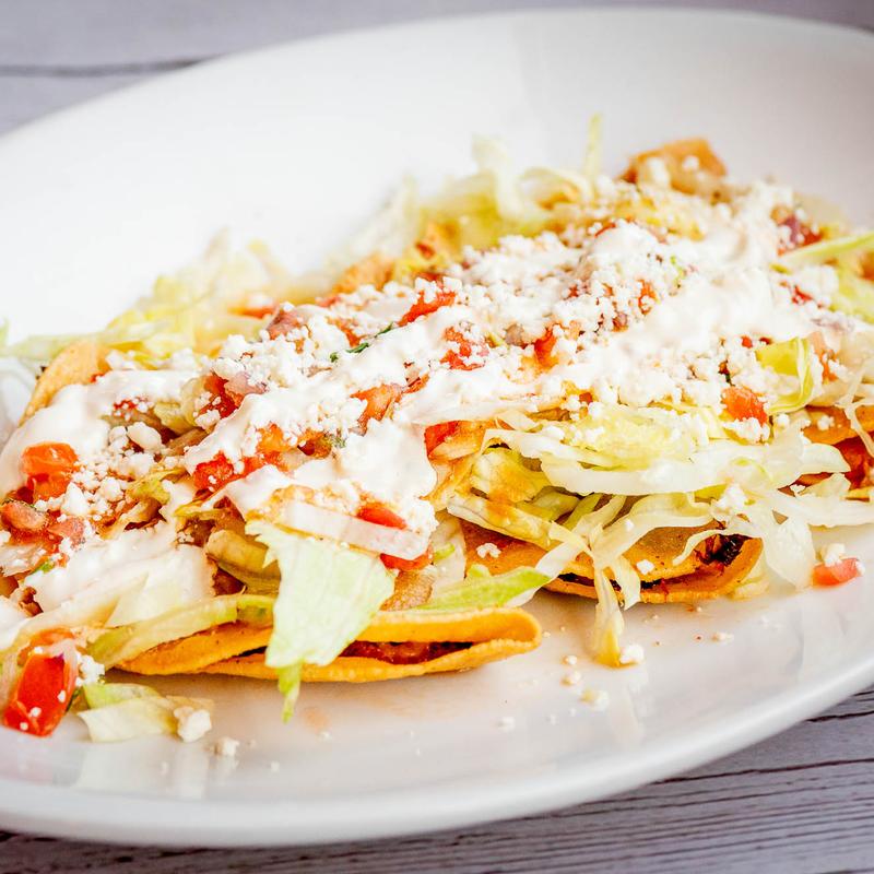8 Small pieces rolled flour tortilla, deep fried with your choice of meat, chicken or shredded beef, with salsa and sour cream on the side